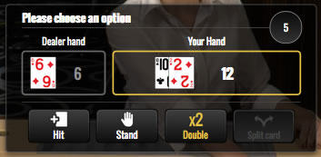 Canlı Blackjack oyunu sırası size geldiğinde, size açık seçeneklerle birlikte kartlarınızı gösteren yeni bir pencere açılacaktır. Süre dolmadan önce bu seçeneklerden birine tıklamanız gerekir, aksi takdirde sistem otomatik olarak bekler. |